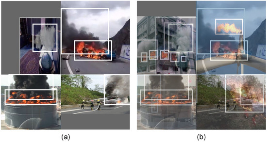 In the context of deep-learning-based video-fire-detection tasks, addressing challenges such as limited sample quantity and uneven sample distribution across different scenarios is crucial to enhance the performance, generalization capability, and robustness of the models employed. One effective approach involves the targeted utilization of data augmentation techniques. Specifically, for fire images, data augmentation methods such as CutMix, Mosaic, MixUP, GridMask, and Gaussian blur can be employed to augment the diversity of the dataset. Figure 2 shows the Mosaic and MixUp data augmentation methods, with the white boxes representing bounding boxes of smoke or flame objects. To enable the network model to learn more-comprehensive semantic features, a combination of data augmentation techniques is often employed in various forms, which results in richer and more-complex approaches compared to geometric and color transformations.