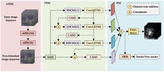 Fire recognition refers to determining the presence of smoke or flames in an image, representing the coarsest classification level in fire detection. Classic classification networks based on CNNs, such as AlexNet [41], GoogLeNet [42], VGGNet [43], ResNet [44], MobileNet [45], and DenseNet [46], have been employed for fire-recognition tasks, significantly enhancing the robustness of the models in identifying environmental features, while reducing false positives. Muhammad et al. [47] proposed a method that incorporates the lightweight network SqueezeNet as the backbone network and fine-tunes its architecture, including using smaller convolutional kernels and excluding dense fully connected layers for video fire detection. The results demonstrated that this model is more efficient regarding model size and inference speed. Additionally, the authors developed an algorithm to select fire-sensitive feature maps from the convolutional layers, enabling further analysis of flame propagation speed and determination of the fire’s severity or degree of combustion. Yuan et al. [48] proposed a deep multi-scale CNN (DMCNN) for smoke recognition. It incorporates the multi-scale convolutional structure of Inception to achieve scale invariance and adopt multi-scale additive merging layers to reduce computational cost while preserving more dynamic and static smoke features. Khudayberdiev et al. [49] proposed a lightweight fire-detection model, Light-FireNet, inspired by the concept of hard Swish (H-Swish). This network combines a more-lightweight convolution mechanism with a novel architectural design, resulting in a smaller model size while maintaining high detection accuracy. Zheng et al. [50] proposed a dynamic CNN model named DCN_Fire for assessing the risk of forest fires. This approach utilizes principal component analysis (PCA) reconstruction techniques to enhance inter-class discriminability and employs saliency detection to segment flame images into standard sizes for model training. The experimental results demonstrated that DCN_Fire achieved an accuracy of 98.3% on the test set. Majid et al. [51] proposed a CNN model with an attention mechanism for fire detection and employed GRAD-CAM visualization to display the contribution distribution of the model’s flame predictions. This model achieved high Recall Rates of 95.4% and 97.61%. Tao et al. [52] proposed an adaptive frame-selection network (AFSNet) for video smoke recognition, as shown in Figure 3. This method automatically selects the most-useful video frames to reduce feature redundancy and introduces enhanced dilated convolution to mitigate the loss of detailed information. The method learns discriminative representations by considering multi-scale, context, and spatiotemporal information. The experimental results indicated that the proposed method achieved an accuracy of 96.73% and an F1-score of 87.22% on the SRSet dataset. However, the proposed method has not been experimentally evaluated for smoke recognition in mobile scenarios. SE-EFFNet, proposed by Khan et al. [53], utilizes EfficientNet-B3 as the backbone network for extracting useful features. It employs stacked autoencoders to achieve effective feature selection. EfficientNet ensures a balance among depth, width, and resolution dimensions while introducing the dense connectivity network from DenseNet to ensure effective fire scene recognition. The experimental results demonstrated that, compared to the baseline model, SE-EFFNet achieved a lower false positive rate, false negative rate, and higher accuracy. However, this architecture may suffer from overfitting in complex environments, and its performance in real-time processing on resource-constrained devices is average when deployed.
