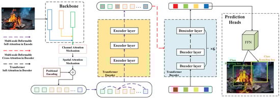 In recent years, the Transformer framework has become the mainstream architecture in natural language processing due to its robust feature-extraction capabilities. Its applications in the visual domain have also gained widespread attention and utilization [80]. Li et al. [81] incorporated a CNN into the popular DETR network for fire detection, as shown in Figure 4. This network enhanced the detection of small objects by adding a normalization-based attention module [82] during the feature-extraction stage and employing deformable attention mechanisms in the encoder–decoder structure. However, this approach has drawbacks, such as slower processing speed and higher device requirements. Yang et al. [83] proposed a fire-detection network called GLCT, which combines a CNN and Transformer. The model introduces a backbone network called MobileLP based on the MobileViT block [84], enabling feature extraction of both global and local information. By combining SPP with a BiFPN for feature fusion and incorporating YOLO Head, the GLCT network was constructed holistically. The experimental results demonstrated that the GLCT network achieved an mAP of 80.71, striking a balance between speed and accuracy. Yan et al. [71] proposed a fire-detection model based on an enhanced YOLOv5. They enhanced the model’s feature-extraction capability by introducing coordinate attention blocks, Swin Transformer blocks, and an adaptive spatial feature fusion model.