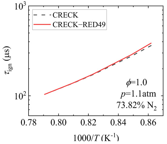 Figure 2 shows a comparison of the results of ignition delay calculated using the CRECk-Red49 model (solid line) and the CRECK model (line) with the experimental study of Kopp et al. [22] as reference for the setting of working conditions, with N2 as dilution gas, close to atmospheric pressure, and an equivalent ratio of 1. The numerical results of the simplified model and the detailed model are basically consistent, with a maximum deviation of 6%, except for the high calculation of ignition delay at low temperature.