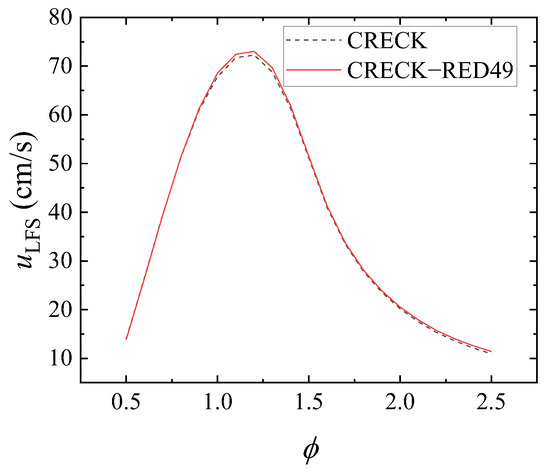 Figure 3 shows a comparison of the results of laminar flame propagation velocity calculated using the CRECk-Red49 model (solid line) and the CRECK model (line) with reference to the experimental study of van Treek et al. [23] at 1 atm pressure and an equivalent ratio range of 0.5–2.5. It can be seen from the figure that the calculation results of the simplified model and the detailed model are very consistent. Only when the flame propagation velocity is near the peak and the equivalent ratio is above two in the fuel-rich condition, the calculation results of the simplified mechanism are slightly higher, but the maximum deviation is 1%.
