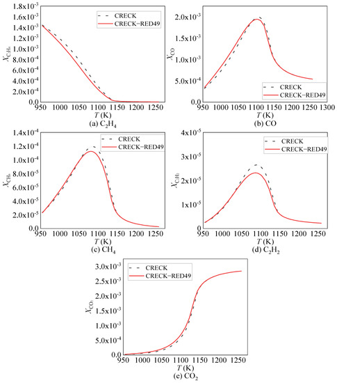 Figure 4 shows the change of (a) C2H4, (b) CO, (c) CH4, (d) C2H2, and (e) CO2 mole fraction with temperature under the working condition of 1atm pressure and 1 equivalence ratio calculated by creck-red49 model (solid line) and CRECK model (scribed line) in the experimental study of jet stirred reactor by Le Cong et al. [24]. Although the simplified model has some deviations in the calculation of the generated concentration of each component when compared to the detailed model, the deviation of the peak molar fraction of C2H2 with the largest molar fraction deviation is 15%, which is acceptable compared with the improvement of the calculation efficiency of the simplified model.