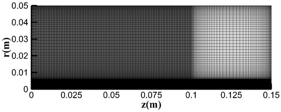 To avoid the impact of grid division errors on the accuracy of the calculation results, grid independence verification was first conducted. This study uses non-uniform structured grids. Through preliminary solution, it was confirmed that the range of temperature gradient change is within the range of z × r = 100 mm × 5.5 mm, therefore, an encrypted uniform grid was used within this range. The size of the grid outside the uniform grid is increased by 1.1 times along the axial direction and radial direction, and the size of the area near the outlet in the axial direction and the free slip wall in the radial direction is slightly reduced, as shown in Figure 6. The uniform grid area is gradually densified, and after grid independence verification, the number of grids used is 70,000, with a minimum size of 0.1 mm. Spatial resolution of computational grid in the area of maxima gradients of concentration is 0.1 × 0.2 mm.