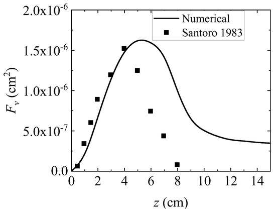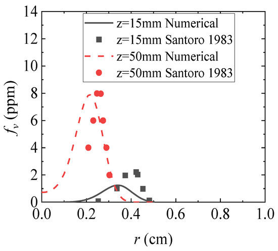 Figure 8 shows the distribution of the radial soot volume fraction from the nozzle axial position z = 20 mm and z = 50 mm obtained through numerical calculation. The numerical calculation results were compared with the experimental results of Santoro et al. [31]. Figure 9 shows the comparison between the axial distribution of integrated soot volume fraction obtained by numerical calculation and the experimental results of Santoro et al. [31]. Integrated soot volume fraction is a representation of the total amount of soot at a specific axial position, which is defined as [32]: