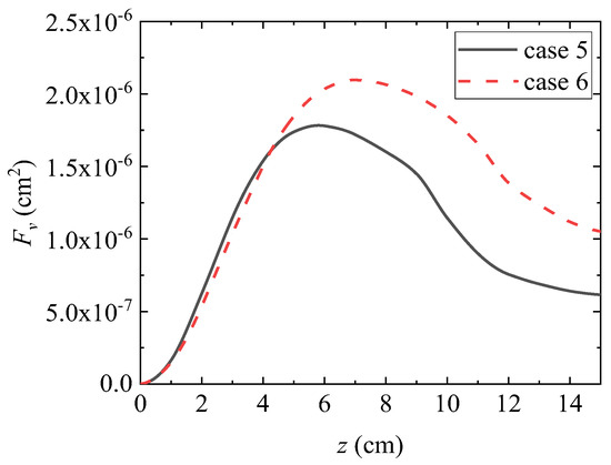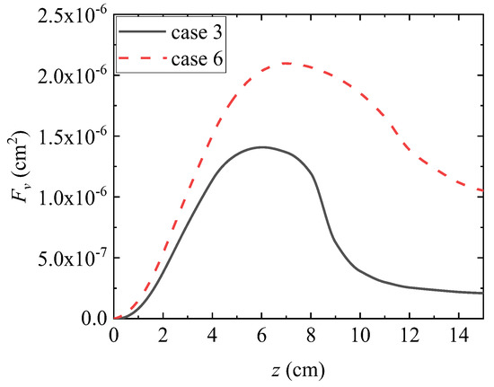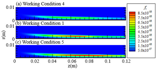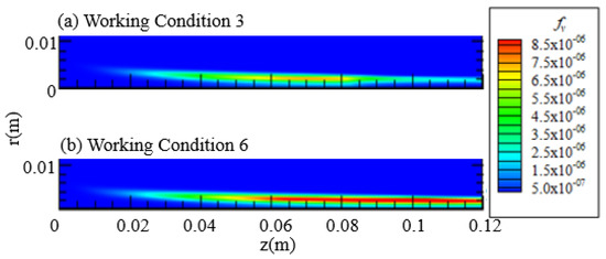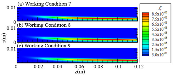 From Figure 13, Figure 14 and Figure 15, it can be seen that keeping the fuel inlet volume flow rate at 4.90 cm3/s results in an improvement when compared to conditions 1, 4, and 5. By increasing the volume flow rate of the accompanying air from 713.3 cm3/s to 1068.3 cm3/s, the volume fraction of soot at each axial position increased. This conclusion is consistent with the comparison results of conditions 1, 4, and 5 with smaller fuel volume flow rates. At the same time, it can be noted that, when compared with the calculation results from condition 1 to condition 5 and from condition 3 to condition 6, due to the increase in fuel volume flow rate, the volume fraction of soot increases more significantly with the increase in wake air volume flow rate.