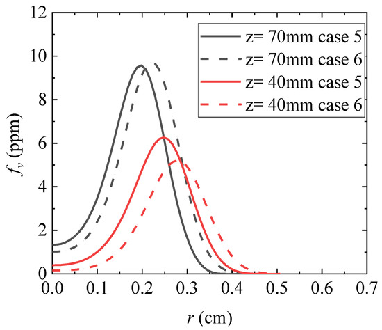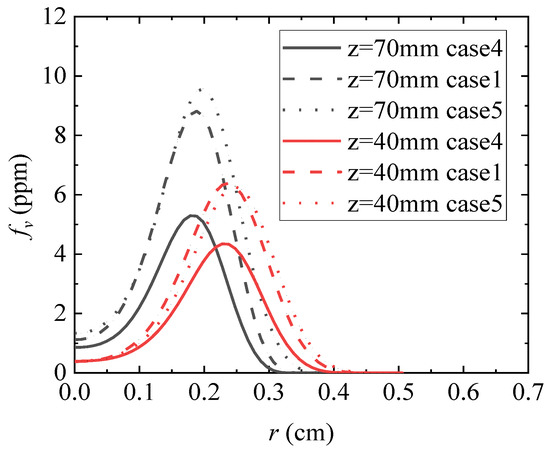 Figure 11 shows the radial distribution of the soot volume fraction obtained through numerical calculation at the axial distance z = 40 mm and z = 70 mm from the burner nozzle under working condition 4 (solid line), working condition 1 (line), and working condition 5 (point line). Different colors are used to distinguish different coaxial positions. Figure 12 shows the axial distribution of the integral soot volume fraction obtained through numerical calculation under working conditions 4, 1, and 5.