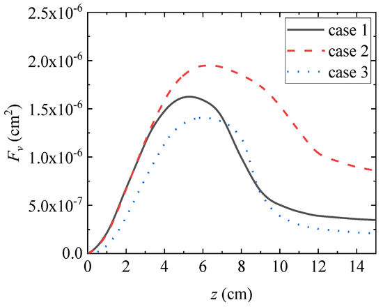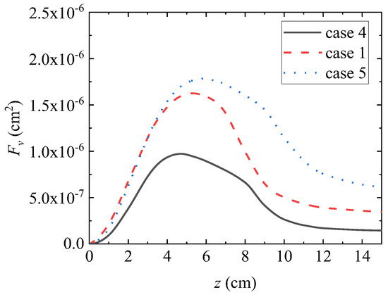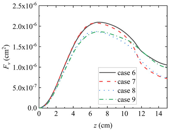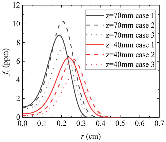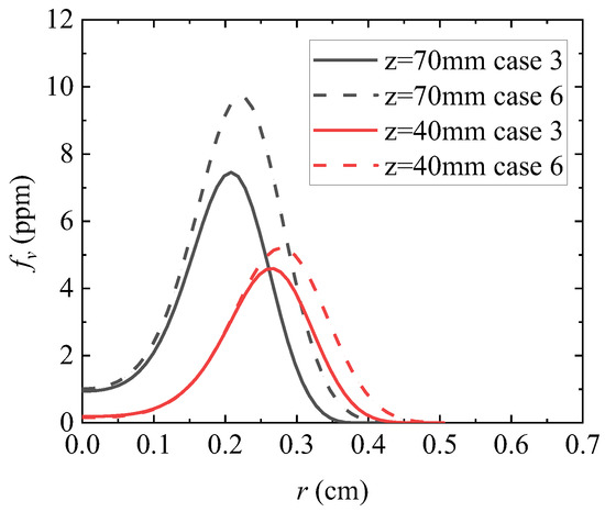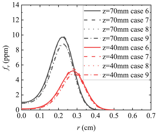 Figure 21 shows the cloud map of smoke volume fraction obtained through numerical calculation under conditions 7, 8, and 9. Figure 22 shows the radial distribution of smoke volume fraction at the axial positions z = 40 mm and z = 70 mm, respectively, calculated under conditions 6 (solid line), 7 (dashed line), 8 (dotted line), and 9 (dotted line). Different colors are used to distinguish different axial positions. Figure 23 shows the axial distribution of the integrated soot volume fraction obtained through numerical calculation under conditions 6, 7, 8, and 9.