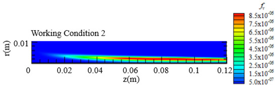 Figure 13 shows the cloud map of soot volume fraction obtained by numerical calculation under working conditions 3 and 6.
