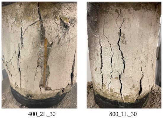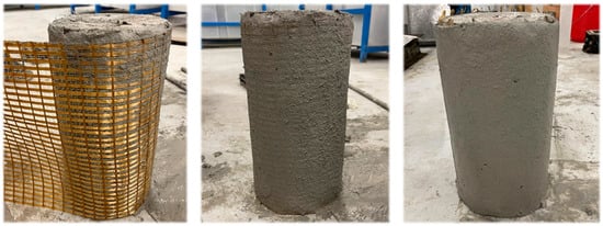 Figure 7, Figure 8 and Figure 9 show the failure modes of selected specimens from Group 1, Group 2, and Group 3, respectively. It is important to note that the specimens were prepared using the hand layup method, which cannot ensure perfect alignment of the fibers, a uniform cement thickness, proper impregnation of the fibers, and an exact overlap length for all the specimens. Such imperfections and nonuniformity in FRCM systems can influence the failure modes of the cylinders.