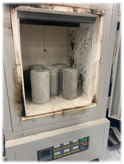 A 500 × 400 × 400 mm electric furnace with a heating capacity of 1000 °C was used to heat the specimens. To ensure proper heat distribution within the furnace, a maximum of 5 specimens were heated at a time as shown in Figure 4.