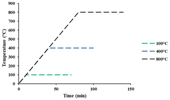 All cylinders were heated to steady-state temperatures up to 800 °C at a heating rate of 10 °C/min. Once the target temperature was reached, the cylinders were kept in the furnace at the target temperature for 1 h after which they were removed from the oven and left to cool to room temperature. Figure 5 shows the curves of temperature vs. time as adopted during testing.