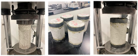 After all specimens were cooled to ambient temperature, they were tested for axial compression until failure. A 3000 kN SANS compression machine was used to load the cylinders according to ASTM C39 standards []. Load–time graphs were obtained for each specimen. To prevent premature failure during testing, 2 layers of CFRP strips were applied on the top and bottom of the cylinders with an average height of 30 mm, as shown in Figure 6. It is important to note that it was challenging to ensure perfect alignment of the fabric during the specimens’ preparation and to maintain a uniform thickness of the cementitious layers. Such imperfections and nonuniformity in the FRCM systems might explain the discrepancy in some of the test results, as detailed later. It was also observed that the FRP strips were not perfectly aligned or bonded to the substrate.