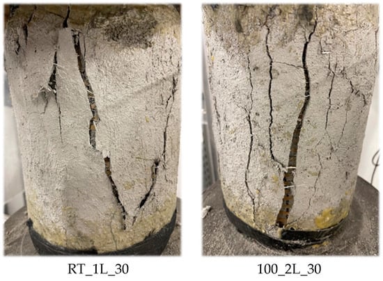 It is important to note that specimens 100_2L_30 of Group 1 and 100_2L_70 of Group 3, which were confined with two layers of FRCM and heated to 100 °C, showed compressive strengths lower than their counterparts 100_1L_30 and 100_1L_70, respectively, which were confined with one layer (Figure 10). This finding was attributed to the premature rupture and debonding of the lower FRP strip as observed during testing and is shown in Figure 7 for specimen 100_2L_30.