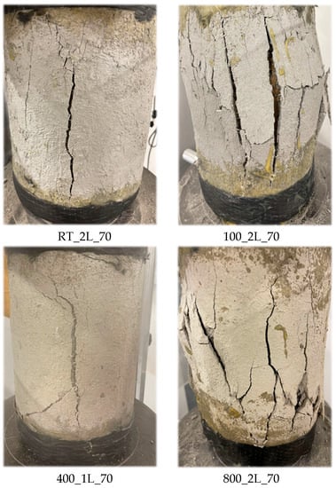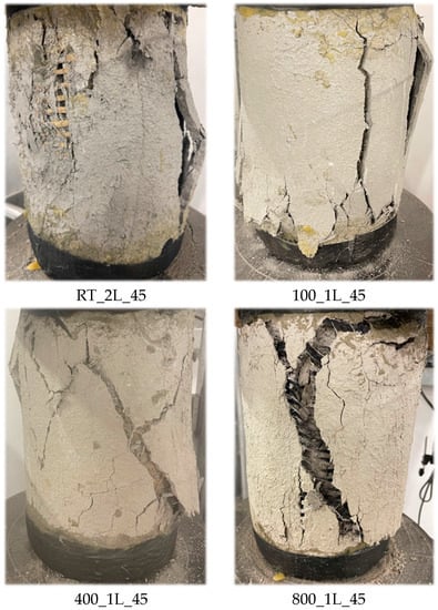 At 800 °C, all control specimens suffered from a significant decrease in their compressive strength. The highest decrease in strength, 82%, corresponded to specimen 800_0L_30 of Group 1, which agreed well with the test results of Chan et al. []. Specimens 800_0L_45 and 800_0L_30 of Groups 2 and 3 lost 54 and 30% of their capacity, respectively.