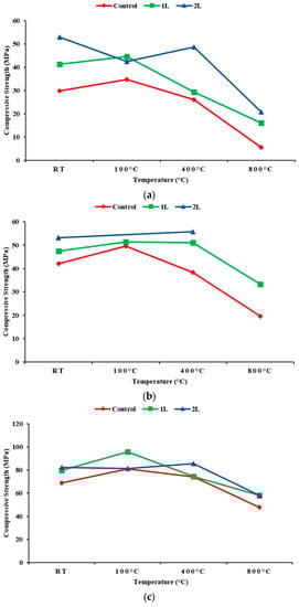 Compressive strength vs. temperature for (a) Group 1, (b) Group 2, and (c) Group 3.
