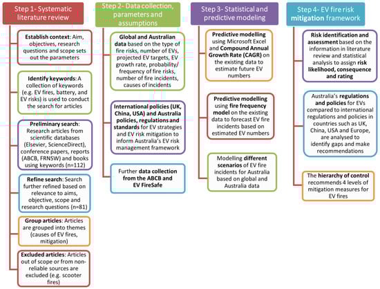 The baseline of data collection was obtained from researching scientific articles published on Google Scholar, ScienceDirect, and other databases such as FRNSW, ABCB, IEA, EVC, ABS, EV FireSafe, Bloomberg, McKinsey, Commonwealth Scientific and Industrial Research Organisation (CSIRO), Clean Energy Finance Corporation (CEFC) and Government reports such as National Electric Vehicle Strategy 2023 by the Department of Climate Change, Energy, the Environment and Water, the Future Fuels Strategy by DISER, and Australia’s Emissions Projections 2022. The search focused on specific keywords such as EV numbers, ICEV numbers, Australian motor vehicles, ten-year car statistics, passenger vehicles, EV projections globally, EV projections for Australia, forecasting models, EV projected targets for Australia, EV projected targets globally, global car market, EV growth rate, cars growth rate, Compound Annual Growth Rate (CAGR), and EV strategies for Australia. These keywords were chosen to screen data sources and articles based on the critical criteria and relevance to the main aim and objectives, including research questions related to EV uptake in Australia. This analysis was used to inform the section on forecasted EV fire incidents for Australia. The methodology for predicting EV numbers for Australia is summarised in the steps 2 and 3 of Figure 1.