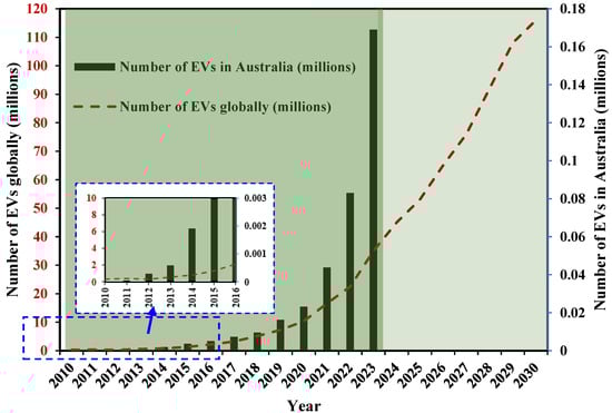 Graphical representations of the growth in EV numbers in Australia and globally using current data are shown in Figure 2. The global data trend shows the change in EV numbers from 0.37 million in 2011 to 22.5 million EVs in 2022 []. Figure 2 also indicates that the number of EVs in Australia increased from 49 EVs in 2011 to 83,000 EVs in 2022 []. The growth in EV numbers (3.8% annually) for Australia is significantly lower compared to global numbers (14%) in 2022 due to fewer EVs entering Australian markets and low EV uptake in the initial years [,]. Estimates by Bloomberg show Australia is roughly five years behind Europe and the USA while lagging around ten years behind China. The global stock of EVs is predicted to reach 116 million units, which is 60% of total sales by 2030, to achieve net zero CO2 emissions by 2050 []. The exponential growth in EV numbers globally is related to more stringent emission targets, more EV models in the market, enhanced fuel efficiency standards, EV and Li battery supply chain expansions, EV subsidies, tax incentives, or a detailed sales target for emission reduction, and greater charging infrastructure and availability.