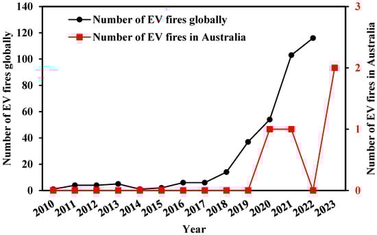 Figure 3 shows the comparison of EV fires globally with EV fires in Australia. In Australia, EV numbers are expected to exceed 1 million in 2023 []. As EV numbers increase in Australia to a forecast total of 15.8 million EVs by 2050, it is expected that the number of EV fires will increase relative to the increase in EV numbers. Other countries experienced similar trends. For example, the UK experienced a surge in EV fires from 32 fires in 2020 to 102 fires in 2021 as more EVs were introduced into the market [].