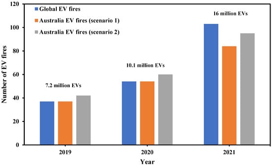 A comparison was conducted between global and Australian data to validate the model, as depicted in Figure 5. For instance, when the number of EVs reached 7.2 million, there were 37 global fires, and the estimated EV fires in Australia was 37 for scenario 1 and 42 for scenario 2. Similarly, with 10.1 million EVs, there were 54 global fires, and the estimated EV fires in Australia for scenarios 1 and 2 were 54 for 60, respectively. However, as the number of EVs reached 16 million, the estimated range for EV fires in Australia was lower, ranging from 84 to 95 fires. In contrast, globally, there were close to 103 fires reported for a similar number of EVs. This disparity could be attributed to the slower uptake and transition period for EV adoption in Australia and advancements in technology, standards, and compliance requirements, which likely contribute to improved safety measures.