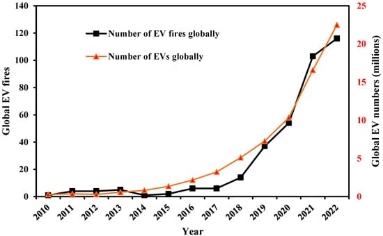 Graphical representation of EV numbers and EV fires globally between 2010 and 2022 are shown in Figure 6. In recent times, the percentage of fires increased from 1.4% (6 fires) in 2017 to 2.5% (37 fires) in 2019 to 9% (103 fires) in 2021 and 10% (116 fires) in 2022 []. During this period, EV numbers were seen to increase globally from 3.2 million (2017) to 7.3 million (2019) to 16.5 million (2021) and 22.5 million (2022) []. In the early years between 2010 and 2013, when there were less than 0.5 million EVs globally, the percentage of EV fires was less than 0.5% or no more than five fires []. Between 2013 and 2017, EV numbers increased from 0.8 million to 2.2 million, and the percentage of fires was less than 1% [].