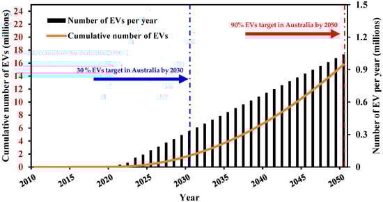 The model also used a conservative Compound Annual Growth Rate (CAGR) to forecast EVs for 2050 (Equation (1)) based on historical EV trends and targets set for Australia [,].