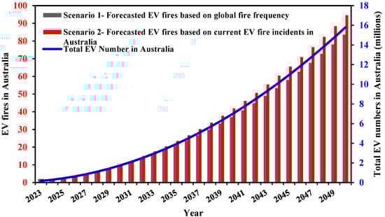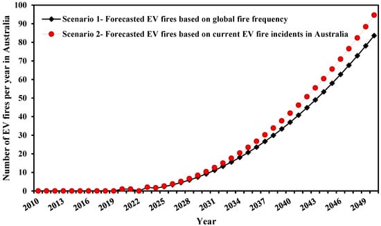 The statistical analysis used predictive modelling on the existing baseline data and estimated EV numbers to estimate future fire events with EVs for Australia. There is a need for additional data on estimated fire incidents and risks beyond 2022. Fire frequency was the main formula to forecast EV fire incidents in Australia. Fire frequency was calculated based on the number of fires within a specific period of time, i.e., one year. In this study, the fire frequency was calculated by dividing the number of EV fires per year based on the estimated number of EVs in that particular year [].