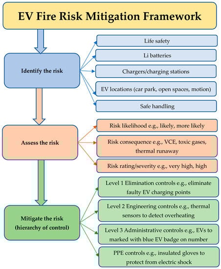 - Level 1 Eliminate the risk—This control eliminates the EV fire risk entirely and offers the highest level of protection []. This is seen as the most effective control measure, e.g., eliminating faulty EV charging points.