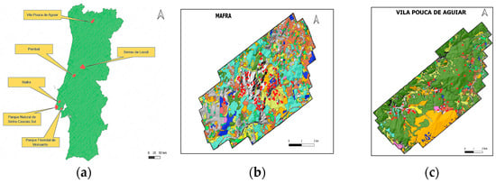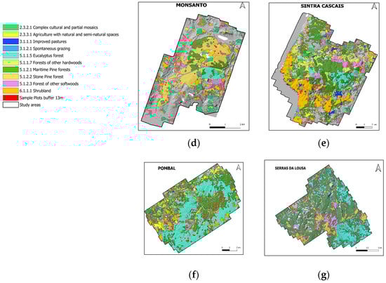 Locations of the six study areas in Portugal (a). Legend with the different colors represents the land use and land cover classification of agriculturas and forest classes for (b) Mafra, (c) Vila Pouca de Aguilar, (d) Monsanto, (e) Sintra Cascais, (f) Pombal, (g) Serras da Lousã. Red points represent the reference field plots.