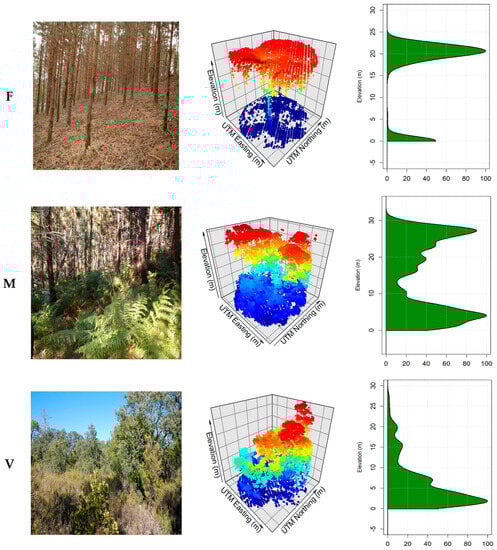 A representation of main fuel groups modelled (F–Litter, M–Litter and Vegetation and V–Vegetation) was generated simulating the waveform from ALS point clouds (Figure 2). Using density histograms, the image illustrates the vertical distribution of point cloud height from the main fuel model groups. Litter (L) represents litter surface fuel layer with slight density ALS returns from low interval height. Mixed (M) group is associated with a mix of litter with herbs, fens, or shrubs in the understory and the presence of trees. Mixed (M) group usually displays a concentration of ALS returns in more than one stratum. V (Vegetation) represents shrublands and grassland fuel models with a more even distribution of ALS returns and higher density of ALS returns concentrated in the lowest strata from the vertical distribution of vegetation. This condition could promote the vertical connectivity with the canopy fuels and how it is appreciated in the figure (i.e., an example of Mediterranean high shrubs with the presence of some trees).