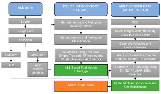 Although fuel mapping in Mediterranean ecosystems has been previously addressed [,,,,,,], there is a lack of research on the combined use of medium resolution multispectral and ALS data. To the best of our knowledge, no previous studies have developed simple, robust, and parsimonious models to provide forest managers with an alternative classification method for mapping Portuguese fuel models based on ALS data. On the other hand, very few studies have evaluated the impact of canopy cover and pulse density on the performance of fuel model classification in Mediterranean areas. Finally, this work aimed to develop the first fuel model classification in Portugal using C-band and L-band (SAR) backscatters, with multi-temporal Sentinel 2 and ALS data associated with a detailed field survey. In this regard, the goal of this study was to combine all sensor data, evaluate the performance of the models, and classify the fuel models according to the national fuel scheme within six study areas in Portugal.