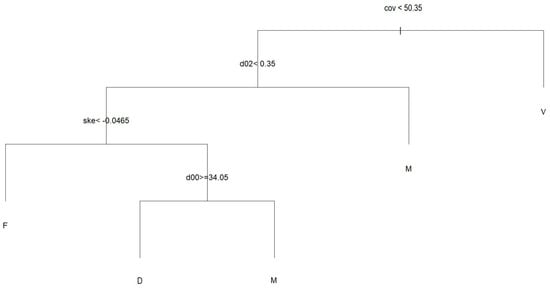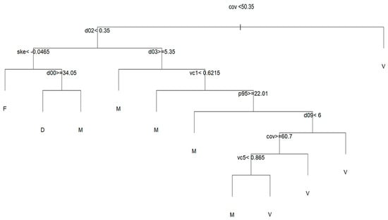 The canopy cover metric (cov) was the best variable to split the data between V and the rest of the fuel model groups. The relative density of points within the 0.2–0.5 m interval was used to separate the M and F group. Then, the skewness split between the F and D–M fuel model groups. Finally, the variable d00, which represents the percentage of coverage in the first 20 cm, was found to be the best predictor variable to split the data into M and D fuel model groups. The confusion matrix (Table 8) correctly classified eight plots as D, twenty-seven as class F, ninety-seven plots as class M, and one-hundred and seventy as class V.
