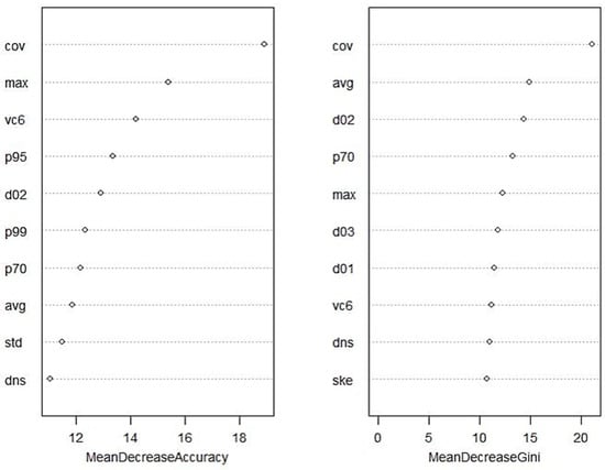 - Han, H.; Guo, X.; Yu, H. Variable selection using Mean Decrease Accuracy and Mean Decrease Gini based on Random Forest. In Proceedings of the 2016 7th IEEE International Conference on Software Engineering and Service Science (ICSESS), Beijing, China, 26–28 August 2016; IEEE: Beijing, China, 2016; pp. 219–224. [Google Scholar]