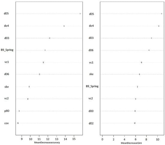 Ten most important variables from the RF model in terms of Mean Decrease Accuracy (left) and Mean Decrease in Gini (right).