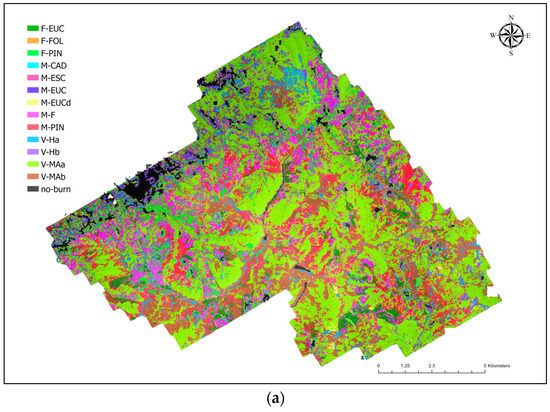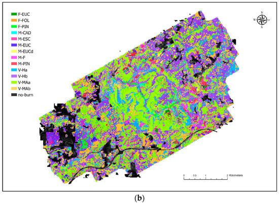 Following the development of fire behavior models, various fuel type classification systems have been created, e.g., Northern Forest Fire Laboratory–NFFL fuel models [] or Canadian fuel types [,]. Due to the difficulties of assessing and mapping different fuel types, specific classification schemes are required for use in similar environmental conditions []. Considering similar spatial resolution and methodological approaches, fuel model assignment error is more likely to occur when a site-specific fuel classification system is used [], compared to a standard classification system, e.g., NFFL. For Mediterranean areas, fuel models (UC040) are adapted fuel models revised by the US Forest Service [] in the Andalucía (Spain) region []. For the purpose of fuel classification, a national classification system was developed in Portugal [,]. The system considers a matrix of percentage of litter and vegetation cover, resulting in four main fuel model groups. (L–litter, M–mixed, D–discontinuous and V–vegetation) associated with 18 fuel models [].
