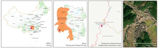 The Western Hunan region investigated in this study is the western region of Hunan province in the cultural sense, i.e., the collective name of the northwestern and southwestern Hunan Province, which comprises the Xiangxi Tujia and Miao Autonomous Prefecture, Zhangjiajie City, Huaihua City, Yongzhou City, and part of Shaoyang City where minority groups live, but not the Xiangxi Tujia and Miao Autonomous Prefecture in the administrative division. Tongdao Dong Autonomous County, which is at the southern end of Huaihua City, Hunan Province, is located in the transition zone of the South Ridge Mountains of the Yunnan–Guizhou Plateau, which is the junction area of Xiang and Guizhou provinces. Gaotuan Village (Figure 1) has been developed for more than a thousand years since its ancestors came here in the early years of the Northern Song Dynasty to set up a fortress and settle down. Since then, Gaotuan Village has grown from a dozen families at the beginning to more than 160 families and 700 people, mainly of Dong ethnicity. Gaotuan Village has preserved the original architectural features of the Dong people, as well as the ethnic culture, and it was listed in the fourth batch of Chinese traditional villages in November 2016.
