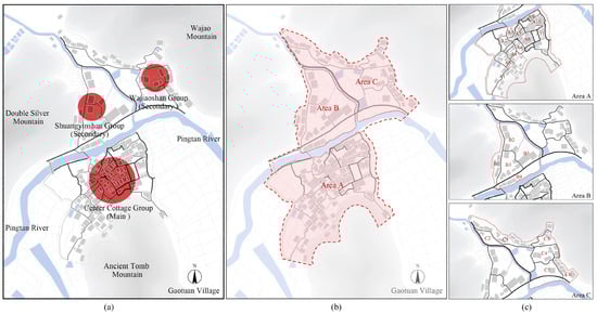 Gaotuan Village expanded from a single village to a “main village–secondary village” layout pattern. To be specific, the central village on the south side of the Pingtan River serves as the main village, and the Shuangyinshan group and Wayao Mountain group on the north side of the Pingtan River act as secondary villages. Regarding the village group, Gaotuan Village falls into three first-class fire protection groups (i.e., A, B, and C). There are relatively spacious rivers and roads between each group such that a natural fireproof isolation zone is formed. Among them, group A serves as the most primitive group, and the residential houses in its group were first formed in the Ming Dynasty, and the group was formed in the late Qing Dynasty. Furthermore, groups B and C were mostly built in the late Qing Dynasty and the Republic of China, and thus, the building density of group A is notably higher than that of groups B and C. Based on the division of the A, B, and C primary fire protection groups, the three primary fire protection groups fell into 11, 5, and 6 secondary fire protection zones according to the width of the streets, the density of dwellings, and the construction time (Figure 2).