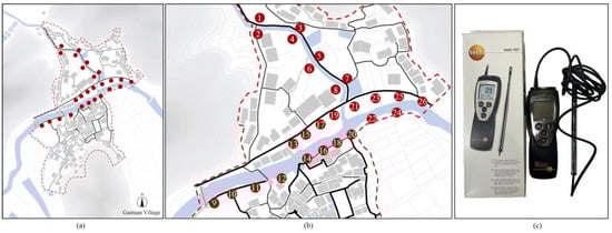 (a) Location of village wind speed monitoring points; (b) monitoring point numbers; (c) monitoring instrument.