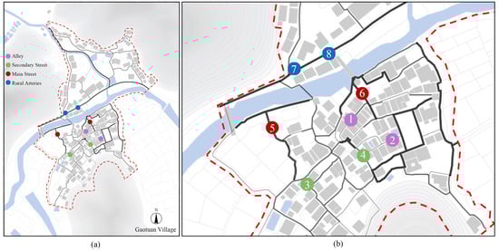 Following the summary of the mapping data, the main streets of Gaotuan Village fell into four levels (i.e., alleys, secondary streets, main streets, and rural arteries), whose corresponding street widths were 0.0–1.5 m, 1.5–3.0 m, 3.0–6.0 m, and 6.0–9.0 m. Under the effect of certain differences in building heights on both sides, the corresponding width-to-height ratios of its four types of streets were determined to be 0.00–0.20, 0.20–0.40, 0.40–0.70, and 0.70–1.0. Gaotuan Village is located in a valley and river bank, the terrain is relatively flat, and its dwellings are lined up along the contour of the mountain on the south side such that its streets and alleys displayed a more significant difference between the relatively flat place and the mountain out. The classification of its streets and alleys suggested that alleys, secondary streets, main streets, and rural arteries accounted for nearly 23.8%, 37.7%, 21.3%, and 17.2% of the entire village roads, respectively. The existence of relatively considerable streets with width-to-height ratios below 0.5 in Gaotuan Village showed a close correlation with the natural geographic environment of Gaotuan Village. Furthermore, following the fire spacing requirements of Chinese wooden buildings, most of the streets and alleys in Gaotuan Village do not conform to the current fire codes in force.