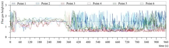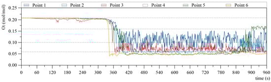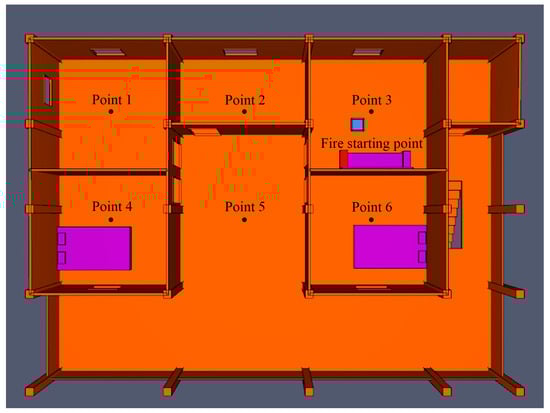 The most typical residential house in Gaotuan Village was selected as the research sample, and a fire simulation was conducted in Pyrosim simulation software and defined as scenario 7. Due to the existence of wind pressure in the room, the sparks in the fire pit could easily flutter with the wind; according to the principle of examining the situation most prone to disasters, the location of the fire source was set up in the sofa armrests in the fire pit room on the second floor. Moreover, the measurement points were set in the respective room of the second-floor living space, for a total of six measurement points that were 1.4 m above ground level (Figure 7).