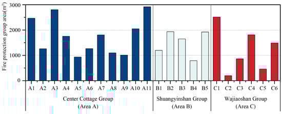 The village of Gaotuan fell into 22 secondary fire protection zones following its natural topography and the texture of the village roads. Moreover, the fire partition area of the respective secondary fire partition was examined and then analyzed (Figure 8), where the minimum area was 195 m2 and the maximum area was 2918 m2. To be specific, less than 1000 m2 and less than 2000 m2 accounted for 22.7% and 77.3% of the total number of clusters, respectively. The area of each of its secondary partitions was less than 3000 m2, which is consistent with the fire prevention and control needs of ancient towns and villages that should be satisfied by building groups with lower fire resistance ratings in China’s current practice. The group buildings were divided into main streets, secondary streets, and alleys, avoiding the continuity of large areas of buildings so that the spread of fire can be significantly reduced.