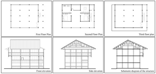 Figure 9 presents a typical dwelling in Gaotuan Village. The basic plan of the Dong traditional dwelling in Gaotuan Village had three openings, mostly with three floors. The second floor served as the main living space, and the staircase went up to a “T”-shaped corridor, acting as the area for receiving guests, communicating, resting, and working. The hall was behind the “T”-shaped corridor, where the statue of the deity was placed for the residents to worship while serving as the ritual center of the house. A storage room was at the back of the hall. The fire pit room was adjacent to the hall, i.e., the center of family activities in the building. The bedrooms were on the left and right of the hall. Furthermore, the residential structure of Gaotuan Village mostly comprised five columns and eight melons.