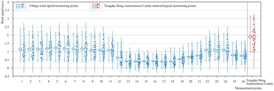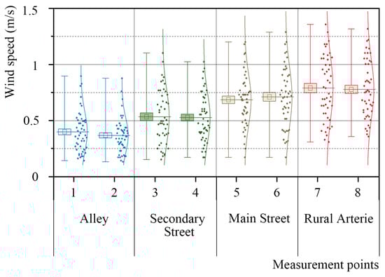 Under an identical external wind speed environment, streets of different widths have a certain influence on the local wind speed of the streets. Gaotuan Village, like other traditional Dong settlements in the western Hunan region, relies on the topography of the terrain to lay out its dwellings, and thus, its streets and alleys also mostly follow the natural topography, forming a pattern of winding and interlocking roads. According to the width of the streets and alleys, we divided them into four levels (i.e., alleys, secondary streets, main streets, and rural arteries). The practical wind speed in identical external environments can be different when the wind enters different streets because of the different widths of the streets to guide the wind. We used a Testo 425 anemometer to monitor the wind speed at two locations in the alleys, secondary streets, main streets, and rural arteries of Gaotuan Village (Figure 6).