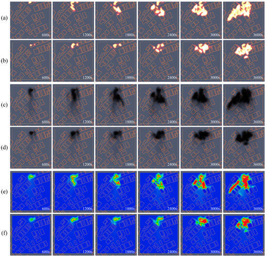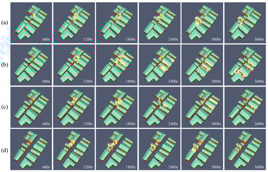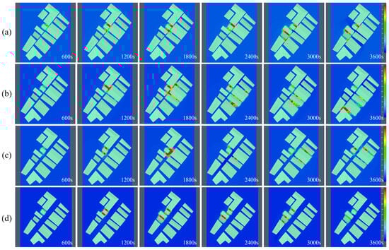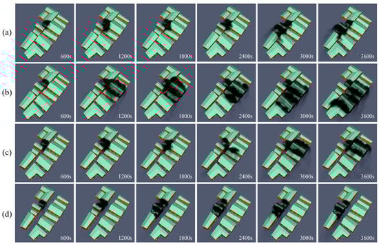 The fire source size was set to 1.0 m × 1.0 m, and the fire simulation duration was set to 3600 s. The other parameter settings were identical to those of the village fire simulation in Section 2.4.1, and the specific parameters of each scene were set (Table 3).