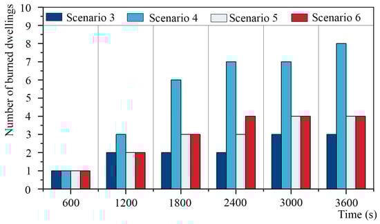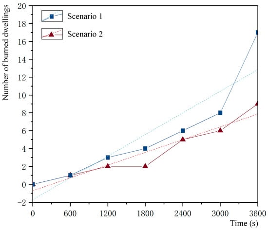 In the village level simulation up to 3600 s, the number of burned houses in scenarios 1 and 2 were 17 and 9, respectively, and the burning rate was nearly double. During the street-level simulation to 3600 s, the number of burned buildings in scenarios 3, 4, 5, and 6 were 3, 8, 4, and 4, respectively. During the building-level simulation, at 320 s, the house in scenario 7 started to burn violently, the smoke spread to the entire second-floor living space, the temperature rose with the increase in the concentration of CO, the concentration of oxygen and the height of the smoke decreased, and the safety of the people in the house was greatly threatened until the house was fully burned at 960 s.