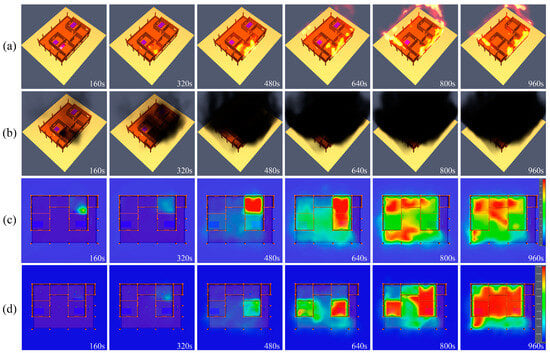 The fire source size was set to 0.20 m × 0.50 m, the fire simulation duration was set to 960 s, and the specific parameter settings were set for the scenario (Table 4). The other parameter settings were identical to those for the village fire simulation in Section 2.4.1, and Table 5 lists the properties of the respective material in the specific building monolith model. When combustion occurred, the specific composition of the combustion products was ignored, as well as the by-products of combustion that do not undergo other chemical reactions.