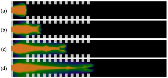 Figure 3 shows the distribution of diesel fuel droplets at different times. After the start of filling, the droplets are distributed in a symmetrical manner throughout the combustion chamber from the moment the supply starts and up to 200 µs. Further, due to instabilities, the distribution of spray becomes slightly asymmetric. The droplets begin to fall into the regions between the roughness of the Shchelkin spiral. At the time of 0.6 ms, after the ignition, the spray begins to evaporate more actively; in the figure, with the time of 0.6 ms, the initiation region is visible. At the time instant of 0.7 ms, after the initiation of detonation, the region with the absence of droplets increases due to their evaporation. From the moment of time 0.8 ms, there are almost no drops left in the chamber.