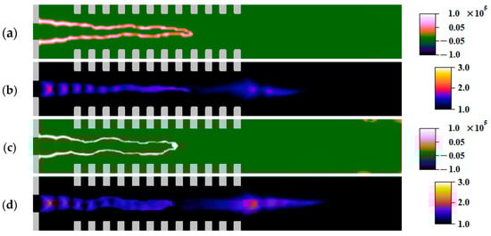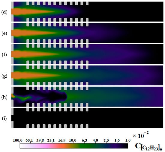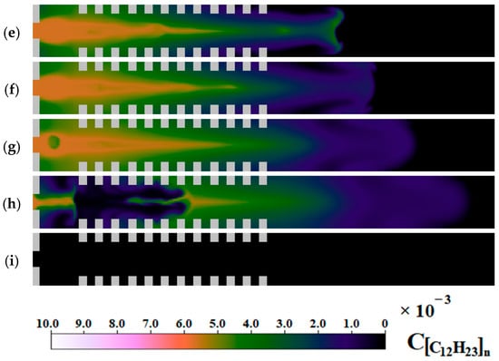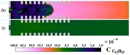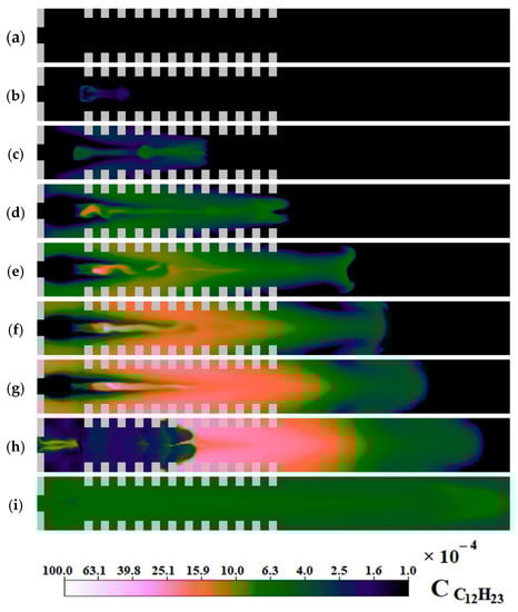 Figure 4 shows the distribution of the molar density of the gaseous phase of fuel at various points in time. The active evaporation phase is visible at a time of 0.1 ms in the region with an increased droplet density. Further, the process gradually intensifies until the start of initiation. After the formation of a detonation wave, the fuel begins to be actively consumed at its front. After 0.8 ms, a small concentration of fuel remains in the chamber, which may be enough to ignite again if not cleaned.