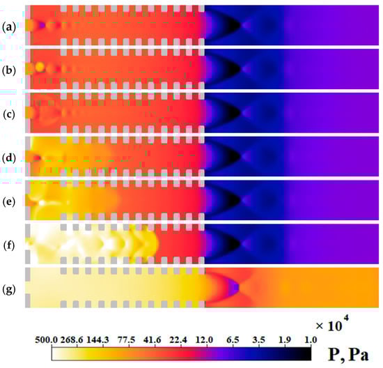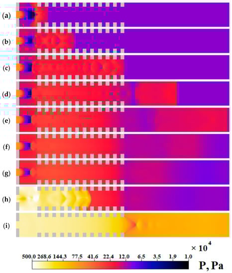 Figure 5 shows the distribution of the pressure field in the combustion chamber at different times. After switching on the supply of reagents, the pressure in the chamber begins to increase in the region of the jet, after the flow touches the Shchelkin spiral, the pressure in front of the spiral increases slightly due to the partial blocking of the flow by the spiral,