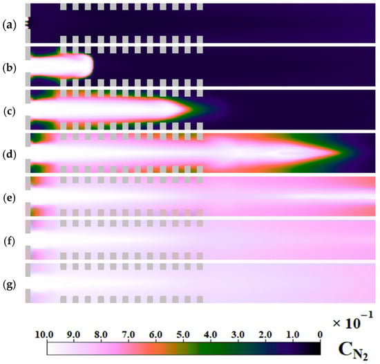 Figure 6 shows the nitrogen molar density distribution at the time from 1.1 ms to 1.7 ms. Nitrogen enters the combustion chamber and gradually displaces the combustion products. By the time of 1.7 ms, the chamber is almost completely filled with neutral gas.