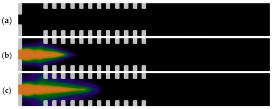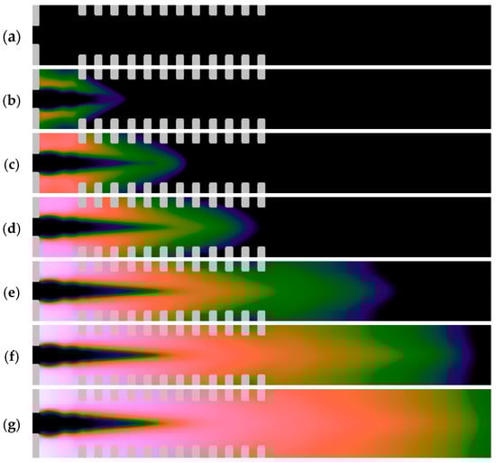 Figure 7 shows the evolution of the liquid phase molar fraction of fuel in the OXY section during the second cycle. Unlike the first cycle, the feed is already carried out into the moving system, the flow is distributed along a more elongated trajectory, the fuel concentration in the pockets of the Shchelkin spiral is slightly less than in the rest of the chamber cavity, and the concentration is also small from the end in the feed zone. After the detonation is initiated, the detonation wave pushes the fuel more actively with the flow.